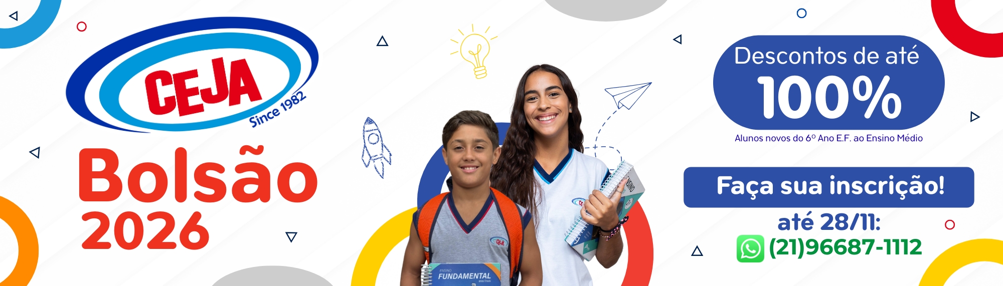 🚀 Bolsão CEJA 2026 🚀 Garanta já sua oportunidade de conquistar descontos de até 100%!O bolsão é destinado a alunos novos das seguintes unidades e turmas:🏫 Nilópolis – 6ºE.F. ao 2º Ano do Ensino Médio.🏫 Éden – 6ºE.F. ao 3º Ano do Ensino Médio. 📅 Data da prova: 27/09/2025 (Sábado).⏰ Horário: 9h às 11h.Locais:📍Nilópolis: Rua Pracinha Wallace Paes Leme, 1521 – Centro, Nilópolis – RJ.📍Éden: Rua Fragata, 39 – Éden, São João de Meriti – RJ.⚠ Inscrições abertas até 26/09!➡ Chame no WhatsApp: (21)96687-1112. Não perca essa chance de transformar seu futuro com a qualidade de ensino CEJA! 💙📚 Edital: clique aqui!