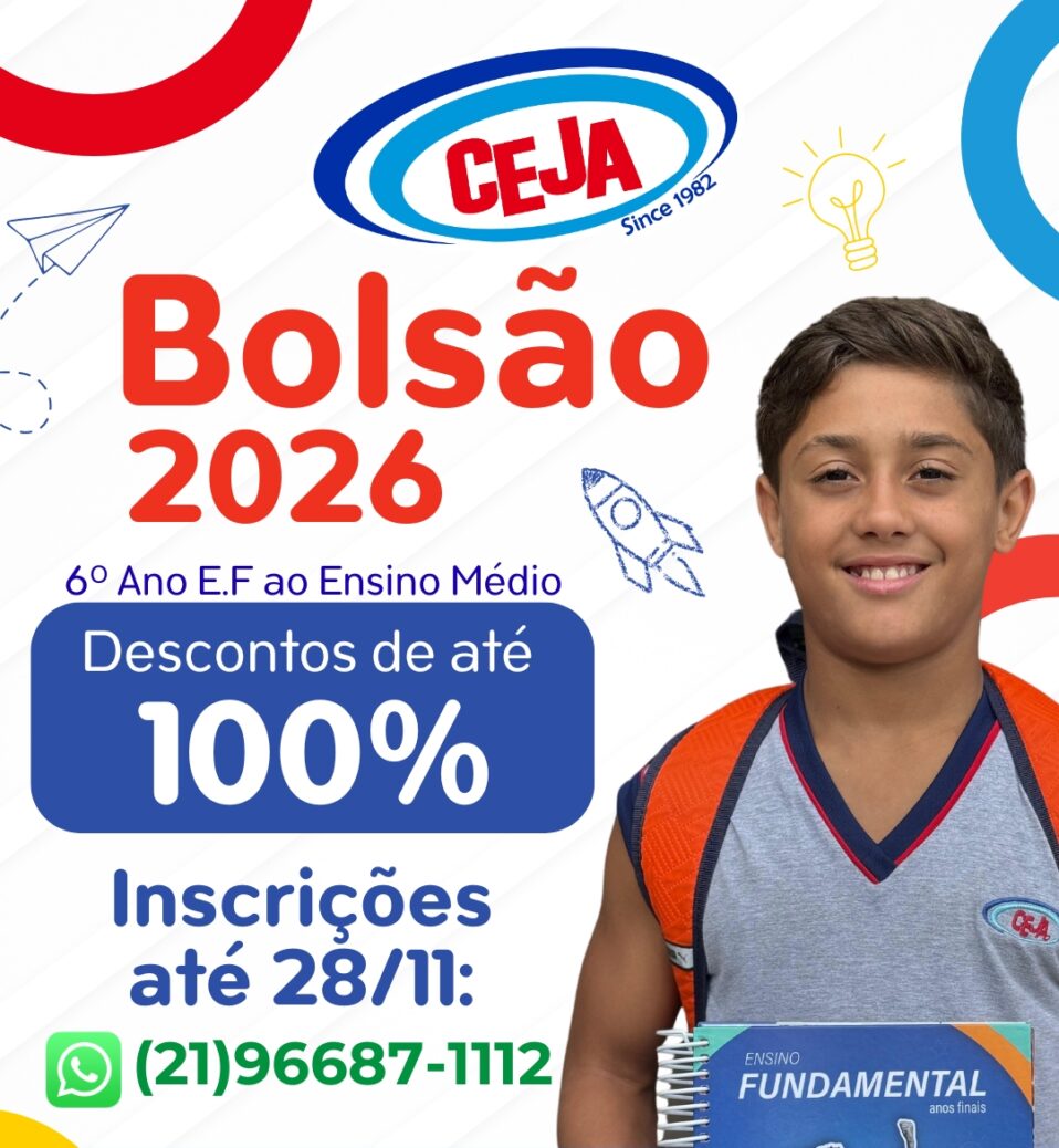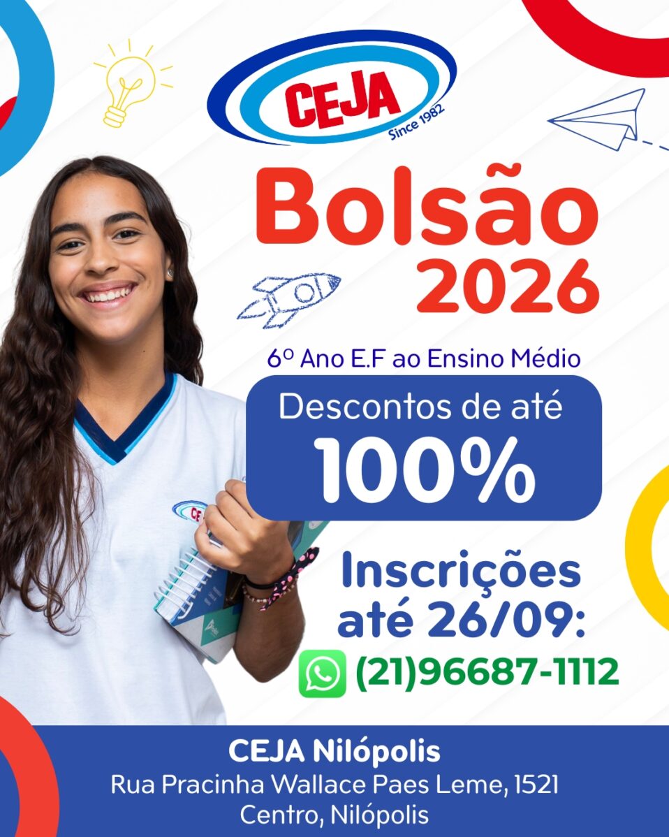 🚀 Bolsão CEJA 2026 🚀 Garanta já sua oportunidade de conquistar descontos de até 100%!O bolsão é destinado a alunos novos das seguintes unidades e turmas:🏫 Nilópolis – 6ºE.F. ao 2º Ano do Ensino Médio.🏫 Éden – 6ºE.F. ao 3º Ano do Ensino Médio. 📅 Data da prova: 27/09/2025 (Sábado).⏰ Horário: 9h às 11h.Locais:📍Nilópolis: Rua Pracinha Wallace Paes Leme, 1521 – Centro, Nilópolis – RJ.📍Éden: Rua Fragata, 39 – Éden, São João de Meriti – RJ.⚠ Inscrições abertas até 26/09!➡ Chame no WhatsApp: (21)96687-1112. Não perca essa chance de transformar seu futuro com a qualidade de ensino CEJA! 💙📚 Edital: clique aqui!